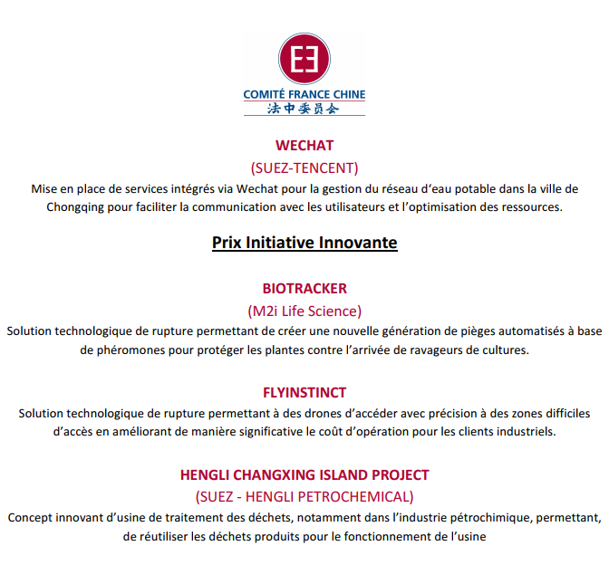 Doyen de la coopération économique franco-chinoise, le Comité France Chine distingue l’innovation au cœur de la coopération franco-chinoise à travers ses Prix de l’Innovation des Equipes franco-chinoises.