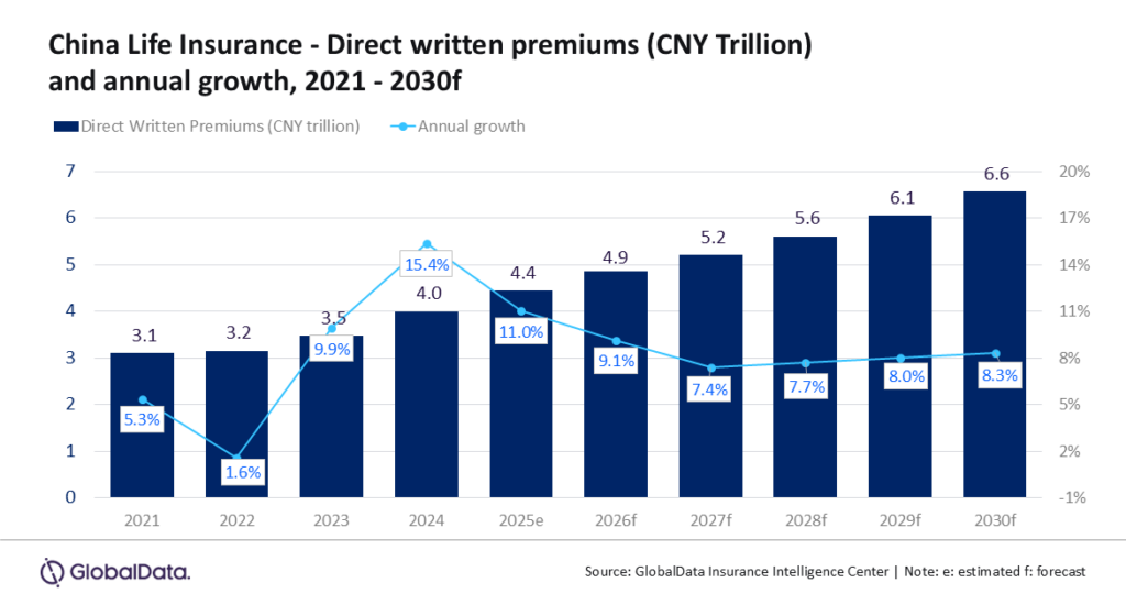 Le marché de l’assurance-vie en Chine devrait passer de 4,9 billions de yuans (679,5 milliards de dollars) en 2026 à 6,6 billions de yuans (927,5 milliards de dollars) en 2030, enregistrant un taux de croissance annuel composé (TCAC) de 7,9% en termes de primes directes émises (PDE), selon GlobalData, société leader dans le domaine des données et de l’analyse.